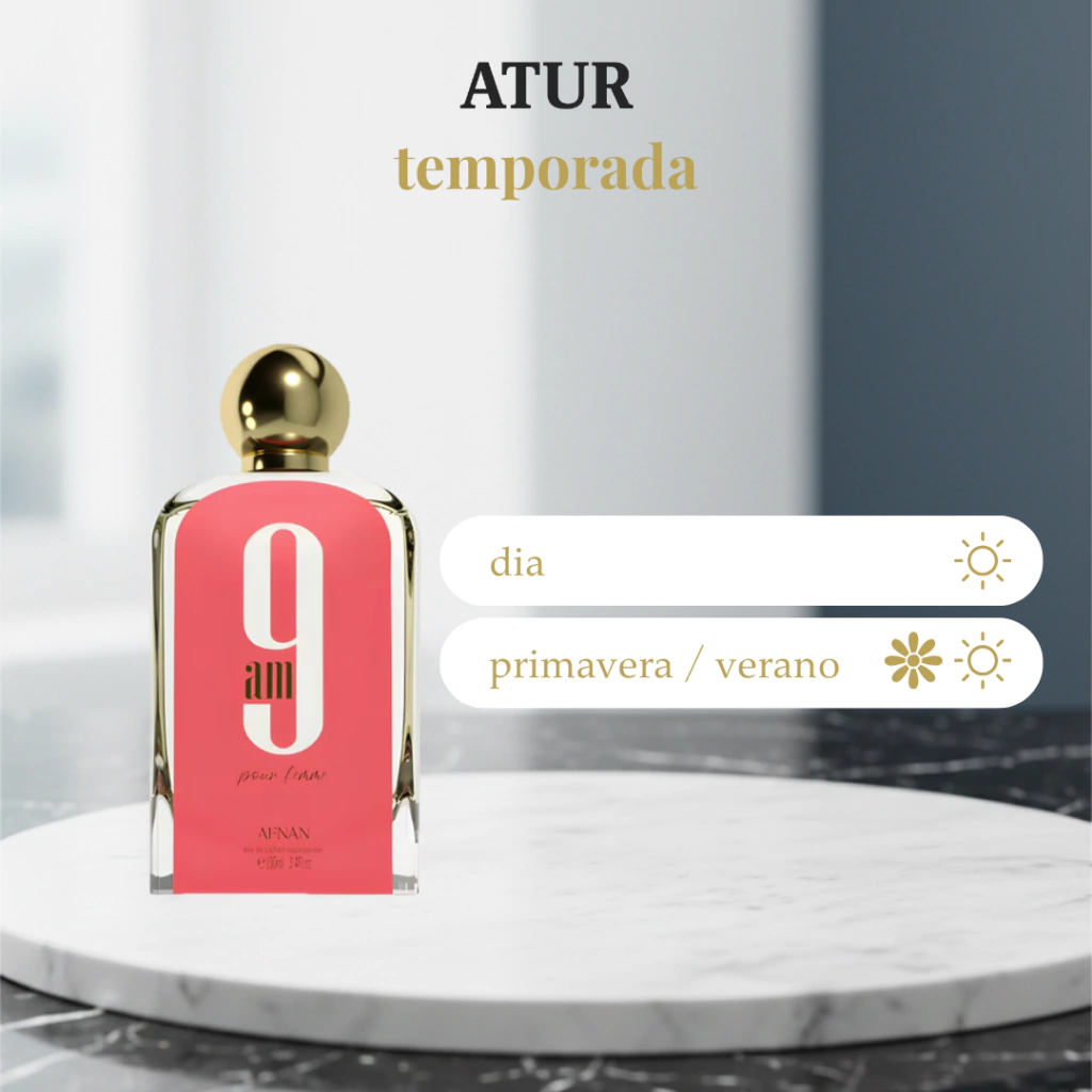 9AM Pour Femme de Afnan es un perfume femenino fresco, luminoso y delicadamente dulce, ideal para comenzar el día con energía y elegancia. Su perfil floral-afrutado transmite limpieza, feminidad y modernidad, convirtiéndolo en una fragancia versátil y fácil de llevar para mujeres que buscan un aroma suave pero encantador.