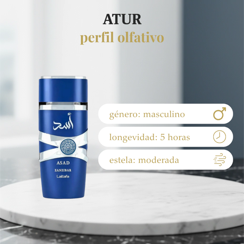 Asad Zanzibar es una versión más fresca y exótica dentro de la familia Asad. Mantiene el carácter masculino, pero con un giro aromático y tropical que aporta ligereza y modernidad, sin perder profundidad.