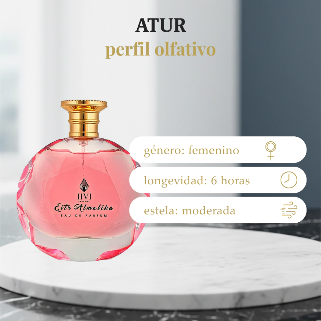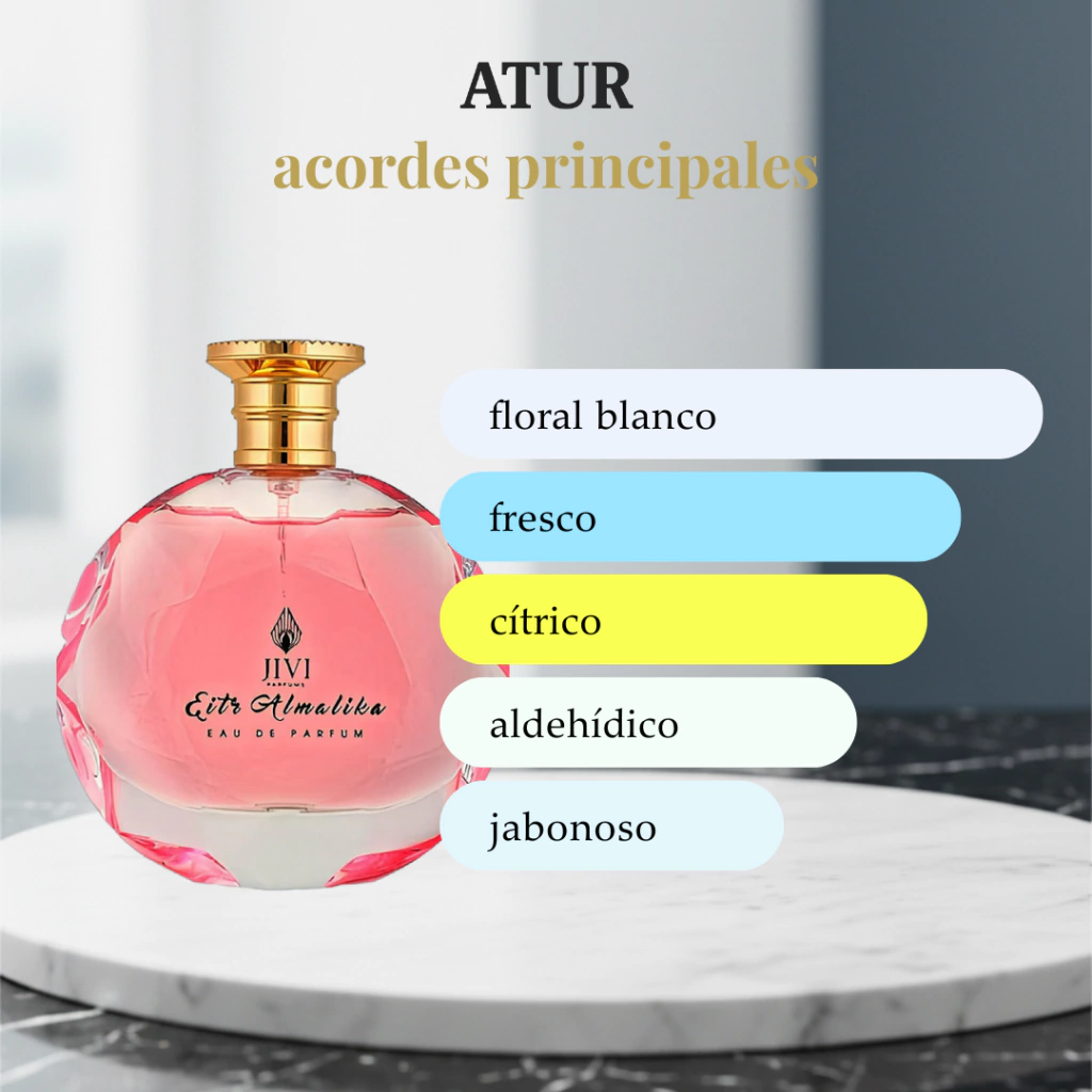 Eitr Almalika es un perfume femenino fresco, floral y delicadamente frutal que transmite elegancia y luminosidad. Su apertura cítrica y suave evoluciona hacia un corazón floral refinado, dejando una estela limpia y femenina. Es una fragancia ideal para mujeres que buscan sofisticación sin excesos, con un aroma versátil y encantador.