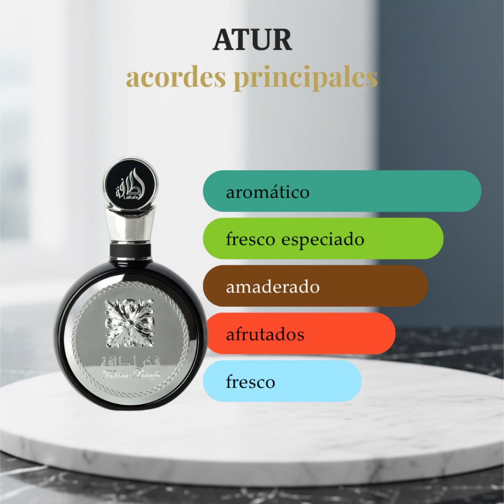 Fakhar Black es un perfume masculino aromático-especiado, moderno y elegante. Combina frescura frutal con un fondo cálido y seductor, logrando un equilibrio perfecto entre sofisticación y atractivo nocturno.
