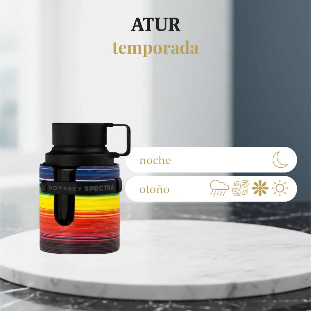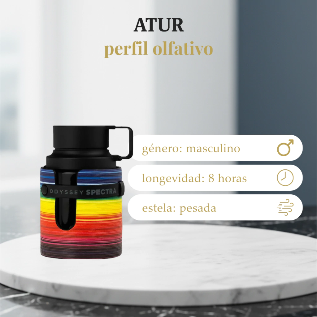Odyssey Spectra es un perfume masculino moderno, vibrante y elegante que combina frescura con un fondo más profundo y sofisticado. Su perfil aromático-especiado lo hace atractivo y actual, ideal para hombres que buscan un aroma con personalidad, versátil y acorde a un estilo urbano y moderno.